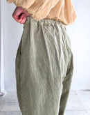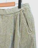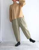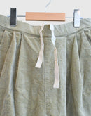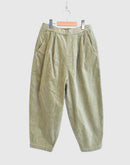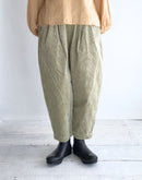 やわらかな光沢と繊細な畝が美しいコーデュロイ素材を使用したテーパードパンツ。 ストレッチの効いた生地は、しなやかで動きやすく、軽やかな穿き心地が魅力です。 ゆったりとした腰まわりから、裾にかけて緩やかに細くなるシルエットは、 ほどよいボリューム感と上品なラインを両立。 短めの丈感でブーツやソックスとのバランスも取りやすく、季節のコーディネートに活躍します。 ウエストはゴム仕様+ドローコード付きで、リラックス感のあるフィット。 着丈の短いトップスにも、オーバーサイズのニットやシャツにも自然に馴染む万能な一本です。日本製