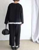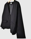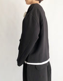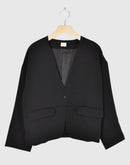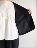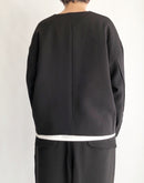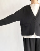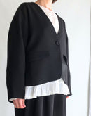 ゆとりを持たせつつ、コンパクトな丈感でスッキリ見えるノーカラージャケット。アクセサリーとのバランスも良く、裾フリルを見せたレイヤードにも。深めのフラップポケットがあるのも実用的。パンツやワンピースにも馴染み、冠婚葬祭だけでなく、普段使いからビジネスシーンまでシーンレスで使用できます。セットアップでのご着用もおすすめです。