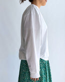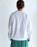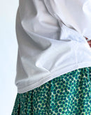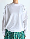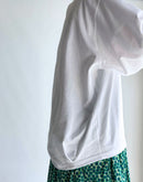 シンプルなTシャツに、さりげない立体感を加えた一枚。 40/2クラシック天竺のコットン100%素材を使用し、やわらかく、日常に取り入れやすい着心地に仕上げています。 身頃に施したタックと、前後で差をつけた着丈が自然な丸みを生み、体のラインを拾いにくいコクーンシルエットに。 一枚で着てもバランスが取りやすく、ベストやカーディガンのインナーとしても活躍します。 ホワイトならではの清潔感があり、季節を問わず着回しやすいのも魅力。 シンプルながらも、さりげなく表情のあるTシャツです。日本製