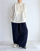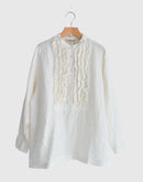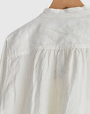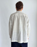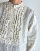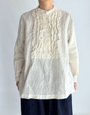 表情豊かなフレンチリネンを使用した、雰囲気のある一枚。 フロントにあしらわれた繊細なフリルが、さりげなく女性らしさを添え、甘くなりすぎない落ち着いた印象に仕上がっています。 リネンならではのナチュラルな風合いは、軽やかで通気性が良く、ほどよいハリ感も魅力。 着るほどに柔らかくなり、肌になじんでいく経年変化も楽しめます。 首元はすっきりとしたスタンドカラーで、全体を上品にまとめつつ、背中のヨーク下には控えめなギャザーを施し、自然な立体感と動きやすさをプラス。 一枚でさらりと着ても、ベストやカーディガンと重ねてもバランスよく、季節の変わり目から長く活躍するリネンシャツです。