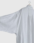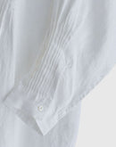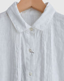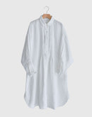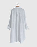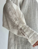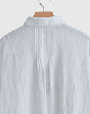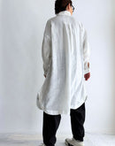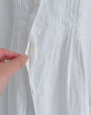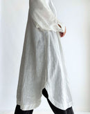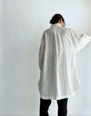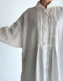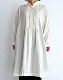 やわらかな肌ざわりの上質なリネン100%。繊細なタックから広がる、ゆったりとしたロングシルエットのシャツです。前見頃・袖口・背中のタック使いが美しく、素材感あるリネンが引き立っています。 ドロップショルダーにたっぷりとしたアームまわり、サイドに丸みのあるスリット入りのラウンドヘム。同色のシェルボタンも映え、フロントタック下からは比翼仕立て、前を開けて羽織りとしても。 春夏は素肌に1枚で心地よく、秋冬はニットやジャケットとのレイヤードにもかさばりません。洗いを重ねるたび、やわらかく身体に馴染んでいきます。表だけでなく、裏側まで美しく仕上げた縫製にもこだわりました。 パンツやスカート、ベーシックなボトムとのスタイリングはもちろん、ワンピースとのレイヤードも◎ 季節の変わり目には軽い羽織りとしても重宝します。