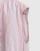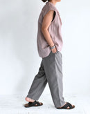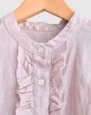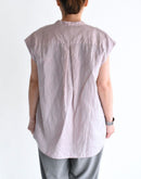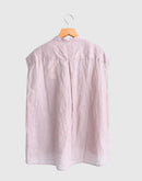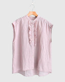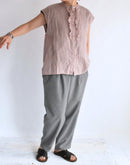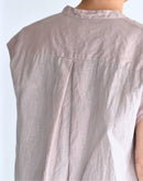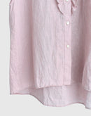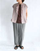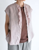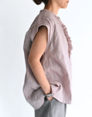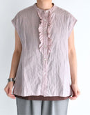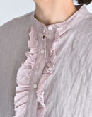 上質なフレンチリネンを使用した、軽やかなフリルブラウス。 フロントにあしらわれたラフなフリルが、甘すぎず、さりげなく女性らしい印象を添えます。 首元はすっきりとしたバンドカラーで、きちんと感のあるデザイン。 風通しの良いリネン素材は、初夏から秋口まで快適に着られ、 カジュアルにも上品にも活躍する一枚です。 軽やかに揺れるシルエットが、日常に心地よい抜け感をもたらします。 日本製