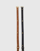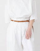 イタリア産のプエブロレザーを使用した、細幅のレザーベルトです。 植物性タンニンで鞣されたレザーは、使いはじめはマットでややざらりとした質感。使い込むほどに自然な艶が生まれ、色合いにも深みが増していく、経年変化をお楽しみいただけます。 革製品ブランド SAFUJI とのコラボレーションにより作られた一本。コバ(革の断面)は丁寧に角を落として磨かれ、自然な表情に仕上げられています。バックルには真鍮を使用し、こちらも使うほどに味わいが深まります。 幅15mmの華奢なデザインと長めのレングスで、コーディネートにさりげないアクセントをプラス。シンプルな装いにも自然になじみ、日常のスタイリングに取り入れやすいベルトです。日本製