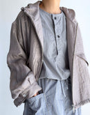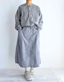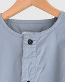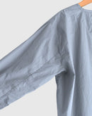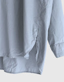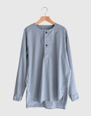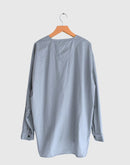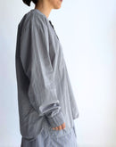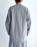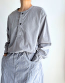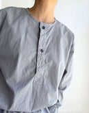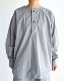 60番手のコットンポプリン生地を使用したヘンリーネックシャツです。高密度に織り上げたコットンポプリンは、ほどよいハリと軽やかさを併せ持ち、製品染めによる自然な風合いと奥行きのある色合いが魅力です。フロントには存在感のあるボタンを配し、ワークウェアらしい雰囲気を感じられるデザイン。裾はラウンドしたカッティングで、全体にゆとりを持たせたシルエットに仕上げられており、やわらかな印象で着用いただけます。一枚でも羽織りとしても使いやすく、男女を問わず取り入れやすいユニセックスなアイテムです。インド製