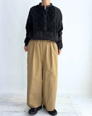 コットン85%、リネン15%の混紡素材を使用した、 maison de soil の2タックワイドイージーパンツ。 COTTON/LINEN DYED WEATHER 生地は、 軽やかさがありながらも、ほどよいハリ感があり、 日常の装いに取り入れやすい素材です。 ウエストはゴム仕様で、リラックスした履き心地。 ウエスト部分に施したタックにより、 ゆったりとした着用感ながら、シルエットが整いやすいデザインです。 ワイドなシルエットですが、裾幅をやや抑えることで、 広がりすぎず、すっきりとした印象に。 シャツやブラウス、カットソーなど、 幅広いトップスと合わせやすい一本です。日本製