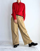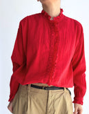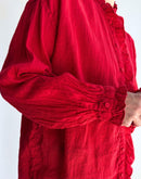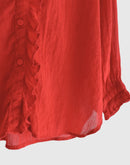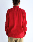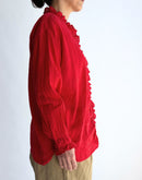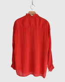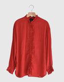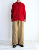 リネンにコットンを織り交ぜた、さらりとした肌触りが心地よい生地を使用したシリーズです。リネン特有の程よいシャリ感にコットンの柔らかさが加わり、軽やかで肌馴染みの良い風合いに仕上がっています。製品染めによる奥行きのある色合いと、自然な表情も魅力です。同素材であしらわれたフリルが印象的なシャツ。ベースはシンプルなバンドカラーシャツですが、ドロップショルダーとゆとりのあるシルエットにすることで、甘くなりすぎないバランスに仕上げられています。程よくフェミニンな雰囲気を持ちながら、日常の装いにも取り入れやすい一枚です。インド製