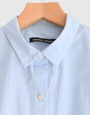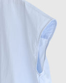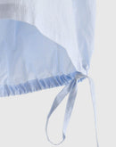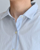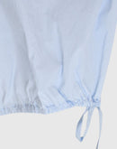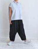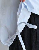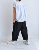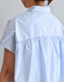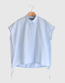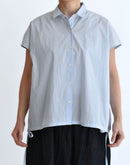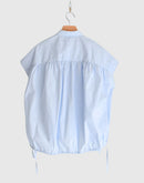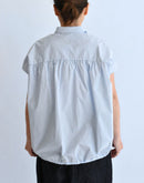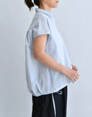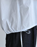 軽やかな素材感と立体的なシルエットが魅力のフレンチスリーブブラウス。コンパクトな襟元とすっきりとした前身頃に対し、背面にはたっぷりとギャザーを施すことで、自然なボリュームと動きのある表情を生み出しています。裾にはドローストリングを配し、シルエットの変化も楽しめるデザイン。コットンにナイロンをブレンドした生地は、ほどよいハリと軽やかさがあり、さらりとした着心地。シンプルながらも一枚で存在感のある一着です。日本製