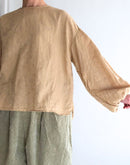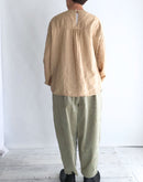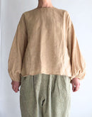 古い人物画に登場する少女のワードローブから着想を得た、どこかノスタルジックな空気を纏うブラウス。 シンプルなシルエットながら、オリジナルで織り上げた薔薇柄のアンティークジャカード生地が、ひと目で印象に残る存在感を放ちます。 コットンとリネンをブレンドした素材は、軽やかで柔らかな質感。 動くたびにわずかに表情を変えるマットな艶が、ナチュラルで上品な雰囲気へと導きます。 袖はゆったりと volume を持たせ、袖口にゴムを入れることで、ふんわりとした丸みのあるフォルムに。 着丈は前後差があり、ボトムとのバランスがとりやすく、パンツにもスカートにも合わせやすい万能な一枚です。 日常に溶け込む優雅さと、さりげない個性を楽しめる、Gauze# らしさが詰まったブラウスです。