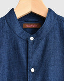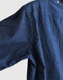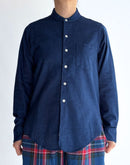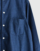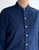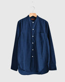 兵庫・西脇の今では希少な旧式力織機で、ゆっくりと時間をかけて織り上げた播州織のインディゴコットン。1日にわずかしか織ることのできないこの生地は、効率よりも風合いを大切にしています。柔らかく、空気を含むような軽やかな質感が魅力です。 織り上がった後に微起毛をかけることで、ヴィンテージウェアのような奥行きのあるインディゴブルーに。光の当たり方や、着続ける時間の経過とともに深みを増す、美しい表情の変化をお楽しみいただけます。 ヴィンテージシャツから着想を得たスタンドカラー、後ろ襟のボタン、前後差のある裾ラインなど、細部まで再現した一枚。ややコンパクトに仕上げたクラシックフィットのシルエットは、身体にすっと馴染み、素肌にも心地よい着心地。フィットバランスは 01・02 の2サイズからお選びいただけます。袖をロールアップしたり、サイズによって異なる着こなしのバランスを楽しめます。