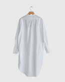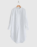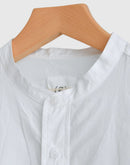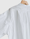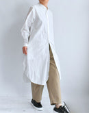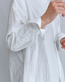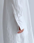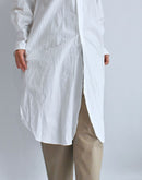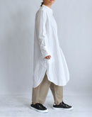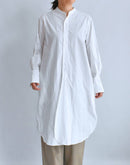 ハリのあるタイプライター生地で仕立てた、バンドカラーのシャツワンピース。 すっきりとした首元と比翼仕立ての前立てが上品な印象を与え、シンプルながら洗練された佇まいに。 ゆったりとした身幅とドロップショルダーがリラックス感をもたらし、体のラインを拾わないストンとしたシルエットが魅力です。 長めの着丈とラウンドヘムが程よい動きを加え、一枚で着映えするデザインに。 サイドには便利なポケット付き。袖口のカフスもアクセントになっています。 軽やかで通気性のあるコットン100%の素材は、季節を問わず快適に着ていただけます。日本製