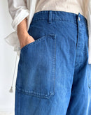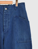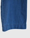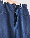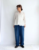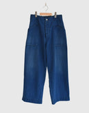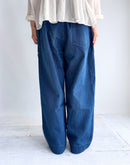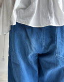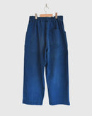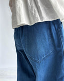 アメリカ・テキサスのコットンをメインにしたブレンドコットンを使用し、岡山県の福山市にて織られたデニム素材です。たて糸はピュアインディゴを用いて糸の中心が白く残るロープ染色をすることで、アタリが出て経年変化を味わうことができます。原料からこだわり、着用していくことに味の出るデニム素材です。11 オンスデニムを使用したパンツ。裾に向かって真っすぐに落ちるストレートシルエット。フロントはボタンフライ開き。ウエストは後ろにのみゴムの入ったイージースタイルです。長年穿き込んだような経年変化を加工で表現しました。初めから柔らかく馴染みの良い着心地も魅力です。日本製