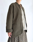 ウールとコットンの素材を使用した、ヘリンボーン織りのスタンドカラージャケット。 今期は表地がコットン、裏面がウールの仕様になっており、表にピリングができにくくなりました。 端正なスタンドカラーとミニマルなデザインがハンサムな印象ですが、裏地のないライトな仕様で、気張りすぎず日常使いしやすいジャケットです。スッキリとしたシルエットですが、ラウンドした裾が柔らかい印象も与えてくれるので、ワンピースなどフェミニンなアイテムとも相性良く合わせていただけます。インド製