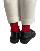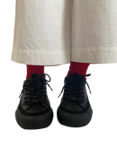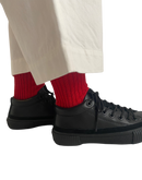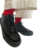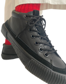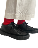 RFWを代表するモデルの一つBAGEL-MID(ベーグル ミッド)が久々の登場となります。アッパーに人工皮革と牛革SUEDEを絶妙に組み合わせることで、見た目にも触れた時の質感にもこだわりました。ブラックのマイクロファイバーがクールでスタイリッシュな印象を与えるだけでなく、汚れが目立ちにくく扱いやすいのも魅力の一つ。大人のカジュアルスタイルにも合わせやすいです。このミッドカットスニーカーはくるぶし丈で履き口がすっきりと作られており、シューレースを締めると足全体を優しくホールドしてくれます。履き口周りにはパッドが入っているので、フィット感は抜群です。また、クッション性のあるインソールが足への負担を軽減し、快適な歩行をサポートします。アウトソールはしなやかながら耐久性の高いラバーソールになります。シンプルなデザインですので、男女問わず幅広いコーディネートに合わせられる万能モデルです。