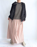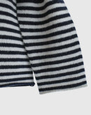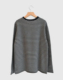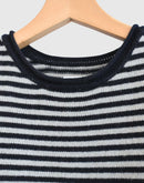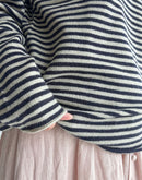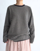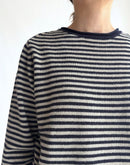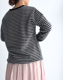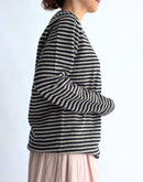 上質なウールナイロン糸を使用したボーダーニットプルオーバー。 ふっくらと柔らかく編み立てられたニットは、軽やかで暖かく、肌にやさしい着心地です。 やや長めの着丈とリラックス感のあるシルエットが特徴で、ラグランスリーブによって肩まわりも動かしやすく仕上げています。 カジュアルな印象のボーダーながら、落ち着いたトーンと上質な素材感で大人っぽく着こなせる一枚。 シンプルながらも存在感があり、冬のワードローブに温もりを添えてくれます。