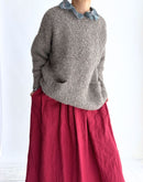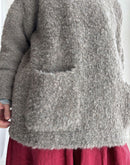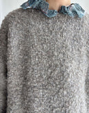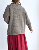 表面にループ状の糸が出るように加工されたブークレ糸で編み立てられています。そのため、もこもことした素材感が特徴で、見た目にも暖かなニットです。素材はアルパカをメインに、ウールとナイロンを混紡した糸を使用。ふわふわと軽く、重さを感じにくいので、着心地の良さも魅力となっています。ドロップショルダーで広い身幅のゆったりとしたシルエット。前身頃の下の方についたポケットがデザインポイントです。真冬はインナーにタートルネックやシャツを着て、レイヤードスタイルをお楽しみいただけます。イタリア製