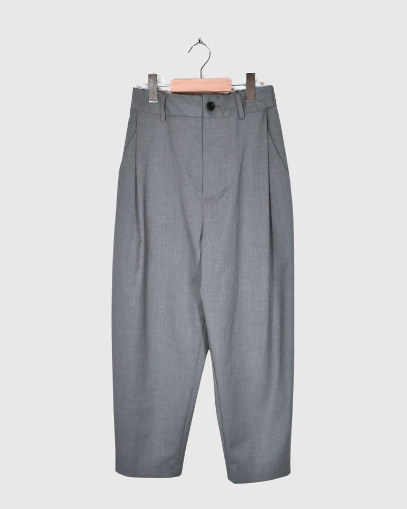 Code:LKL25WPT2124_gy Brand : Kelen   表地:ポリエステル 80% レーヨン 20%裏地:ポリエステル 100%M:ウエストゴム34-52cm ヒップ104cm パンツ丈97cm 股上38cm 股下78cm もも周り78cm すそ周り60cm   ウールライクの素材を使用したタックデザインパンツ。 ワタリにたっぷりとゆとりを持たせて、裾に向かってやや緩やかにすぼまるコクーンシルエット。 ボリューミーですが、立体感が美...