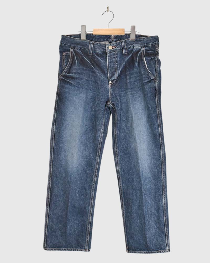 Code : MR-CT5315_03 Brand : MORIKA   11ozムラ糸デニム コットン100%F:ウエスト38cm 総丈102cm 股下67cm   70年代のペインターパンツを基にデザインされたワークデニム。生地には通年着用できる11ozのムラ糸デニム採用し、あえてトリプルステッチを同色にすることで大人っぽく落ち着いた印象に仕上げています。シルエットは、程よいルーズ感で、深めの股上、ゆったりとした渡り巾が抜け感のあるリラックスした...