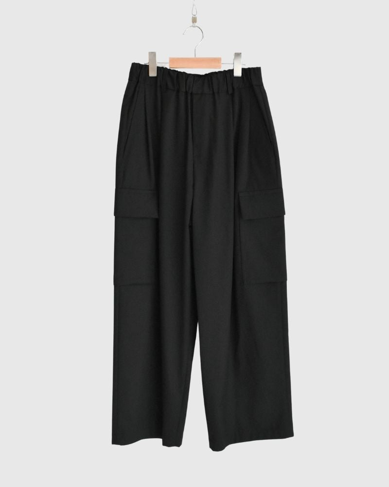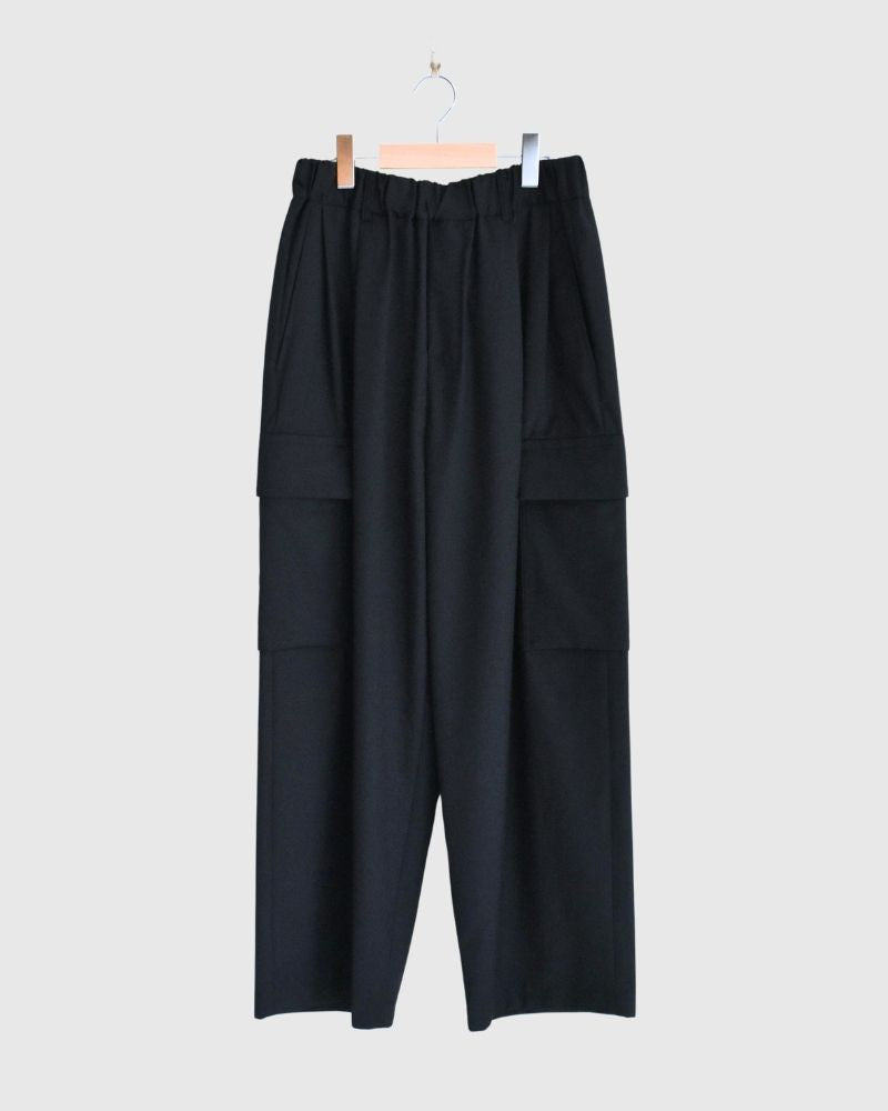 Code : CLOVER-TRO_4 Brand : nicholson&nicholson ポリエステル60% ウール22% レーヨン16% ポリウレタン2%38:ウエストゴム34-47cm 総丈102cm 股下69cm40:ウエストゴム35-49cm 総丈103.5cm 股下70cm   軽やかで落ち感のあるポリエステルウール混素材を使用したカーゴパンツ。 サイドの大きめフラップポケットがアクセントとなり、実用性とデザイン性を兼ね備え...