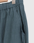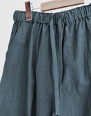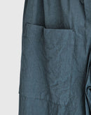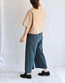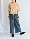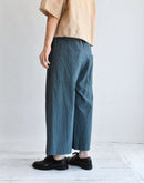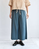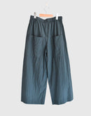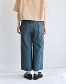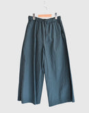 落ち着きのあるダークグリーンが印象的なワイドパンツ。 80番手のタイプライターコットンに硫化染めを施し、独特の風合いとこなれた表情に仕上がっています。 軽やかな穿き心地ながら、ほんのりハリのある素材感でシルエットを美しくキープ。 ウエストは総ゴム+内紐で調整ができ、リラックスして穿けるのも嬉しいポイント。 ヒップや太もも周りには程よくゆとりを持たせ、脚のラインを拾わないストレスフリーなデザインです。 Tシャツやブラウス、ニットとも好相性で、季節を問わず活躍する万能アイテム。 日本製