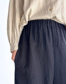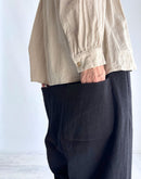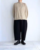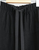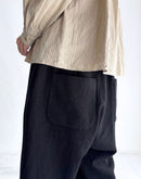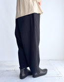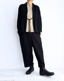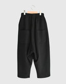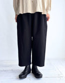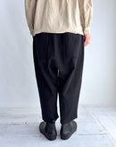 上質なウール素材を使用したリラックス感のあるサルエルパンツ。 ほどよいボリュームと丸みのあるシルエットで、ラフすぎず上品な印象に仕上げています。 ウエストはゴム仕様で、内側のドローコードによりサイズ調整が可能。 バックポケットがアクセントになりつつ、機能性も備えています。 フォーマルなスタイルにも、カジュアルなコーディネートにも合わせやすい一本。 柔らかなウールの質感が心地よく、季節を通して長く愛用できるVeritecoeurらしいパンツです。 日本製