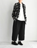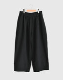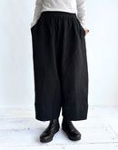 春夏に好評だったヌーボーパンツを、 秋冬らしい表情のオリジナルランダムストライプキルト素材でアップデート。 生地全体に施されたランダムステッチが、自然な凹凸と立体感を生み、 奥行きのある陰影を楽しめる一着です。 やや深めの股上とゆとりのあるシルエットで、 リラックス感がありながらもすっきりとしたラインをキープ。 ウエストは総ゴム仕様で、内側のドローストリングでサイズ調整が可能です。 裏地付きで肌あたりもやさしく、 秋から春先まで長く活躍。 季節の移ろいに寄り添いながら、 matureなスタイルを引き立ててくれる一本です。 日本製