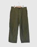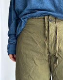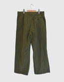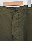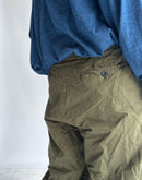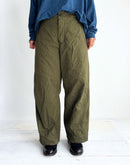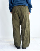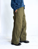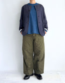コットンの厚手ハイカウントツイル生地を使用したパンツです。製品染め(ログウッド、キハダ)によりパッカリングが起こり、カジュアルな表情に仕上がっています。天然染めによる奥行きのある色合いも魅力です。膝にダーツの入った立体的なワイドストレートシルエットが特徴的。膝上丈の裏地付きです。 日本製