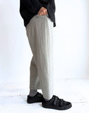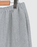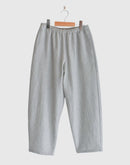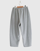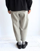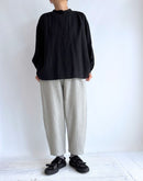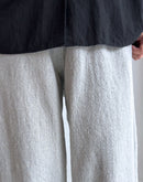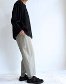上質なウールツイル生地に縮絨加工を施し、ふっくらとした温もりと柔らかさを引き出したコクーンパンツ。 起毛感のある滑らかな表面は肌あたりがやさしく、軽やかな履き心地ながらもしっかりとした暖かさを感じられます。 腰まわりにゆとりを持たせたコクーンシルエットが、動きやすさと美しいラインを両立。 ウエストは総ゴム仕様で、リラックスした着心地とすっきりとした印象を兼ね備えています。 ミニマルで無駄のないデザインが、素材の上質さを際立たせる一本。 シーズンを通して快適に着用できる、denierらしい上品なウールパンツです。日本製