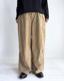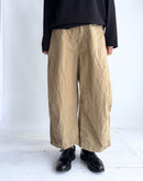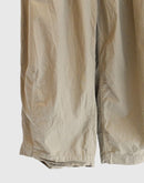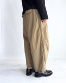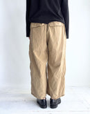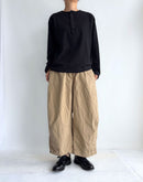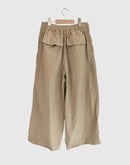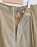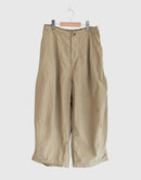 コットン92%・シルク8%を高密度に織り上げた、上質なコットンシルク素材のパンツ。 細番手の糸で仕立てられた生地は、程よいハリを持ちながらも柔らかく、軽やかな穿き心地が魅力です。 フロントは本水牛ボタンを使用したボタンフライ仕様。内側には調整用の紐を配し、後ろウエストはゴム入りで、ボタンをすべて外さずとも簡単に着脱が可能です。 背面には大きめのフラップポケットを備え、実用性とデザイン性を両立。シンプルでありながら上品さを漂わせる一本です。 日本製