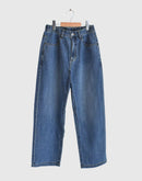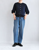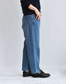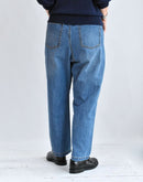 サルエルシルエットのストレートデニムパンツです。 懐かしく感じるサルエルですが、股上のサイズ感を調整し、今時のシルエットに落とし込みまいた。 着心地はイージーですが、細すぎず太すぎないストレートで、履くと綺麗なシルエットに仕上がりました。 ベルトを付けて丈感の調整をしたり、裾をロールアップしたりとスタイリングに合わせて様々な着方を楽しんでいただけます。 程よく立体感の出る10.2ozのデニムは年中使える万能パンツです。