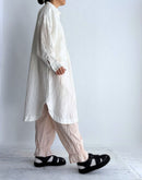 やわらかなコットン素材で仕立てた、軽やかな穿き心地のイージーパンツです。 ウエストは総ゴム仕様で、締め付け感のないリラックスしたフィットに。ゆとりのあるシルエットが、動きやすく快適な着用感を叶えます。 裾にはさりげないギャザーフリルを施し、シンプルな中にほどよいアクセントをプラス。甘くなりすぎないデザインで、カットソーやシャツ、ワンピースとのレイヤードなど、さまざまなコーディネートに自然になじみます。 軽くて通気性のよいコットン素材は、季節を問わずデイリーに活躍する一着です。日本製