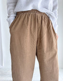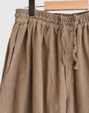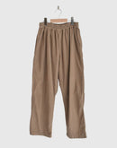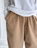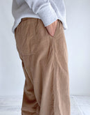 26WALESの細畝のコーデュロイ素材を使用し、ウォーム感がありながらも野暮ったさのないすっきりとした見た目が特徴です。製品染めを施しているので、柔らかな着心地と風合いを楽しんでいただけます。 深めの股上で、腰回りはゆったりとしたイージーパンツですが、裾にかけて緩やかなテーパードのラインで、野暮ったくならずスッキリとした印象で履いていただけます。 ウエスト全体にゴムが入ったイージー仕様で、紐も付いているので、ウエスト位置を調整しやすく、タックインスタイルにも良く合うデザインです。 こちらは男女問わず着用いただけるアイテムです。インド製