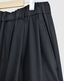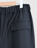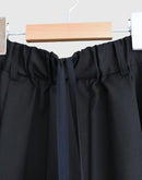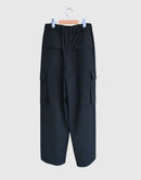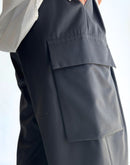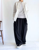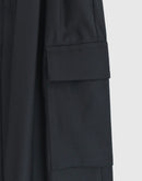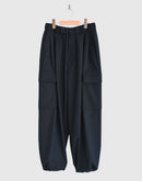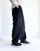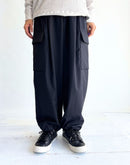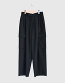軽やかで落ち感のあるポリエステルウール混素材を使用したカーゴパンツ。 サイドの大きめフラップポケットがアクセントとなり、実用性とデザイン性を兼ね備えています。 ウエストはゴムとドローコードでサイズ調整が可能。裾にはドローコード付きで、シルエットをストレートにも絞ったバルーンスタイルにもアレンジできます。 ゆったりとしたワイドシルエットで、カジュアルながらも上品さを感じさせる一本です。日本製