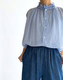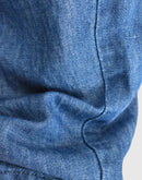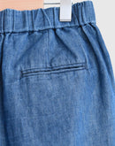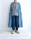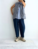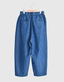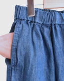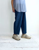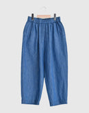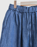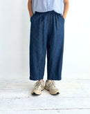 コットンとリネンをブレンドしたデニム素材を使用した、軽やかで心地よいイージーパンツです。一般的なデニムに比べて薄手で通気性がありながら、しっかりとした打ち込みの生地で透けにくく、安心感のある素材感に仕上げています。バイオウォッシュ加工を施すことで、履き始めからやわらかく、なじみのよい風合いも魅力です。ウエストは総ゴム仕様で、内側の紐によりサイズ調整が可能。腰まわりにはタックを施し、ゆったりとした履き心地でありながら、裾に向かって緩やかに細くなるシルエットが全体をすっきりとした印象に整えてくれます。両サイドにはポケットを備え、日常使いにも便利。リラックス感がありながらもバランスよく着こなせる、デイリーに取り入れやすい一本です。日本製