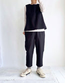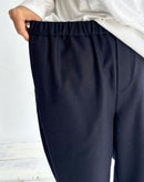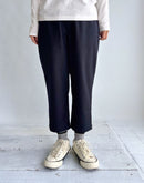 表面に光沢があり、スーツなどにも使われるような上品な印象のウールフランネル生地を使用。 ウールフランネルは、柔らかくて弾力のある素材のため、暖かくシワになりにくいのが特徴です。 こちらはウエスト部分全体にはゴムが入っており、さらに内側から紐で調節が可能なイージー仕様のパンツ。 腰まわりはゆったり、そして裾にかけて細くなるテーパードパンツは、すっきりとしたシルエットです。 股下をやや短めに設定することで、足首周りがもたつかないので、靴下やブーツなどを合わせ、足元のレイヤードを楽しめるのもポイントです。 シャツやブラウスと合わせていただくのはもちろん、ボリューム感のあるワンピースなどの下に合わせても、スッキリとした着こなしが叶います。日本製