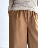 柔らかくふんわりとした肌触りのウールフランネルのパンツは、秋冬のスタイルにぴったりなアイテムです。 ほど良く上品な印象の生地感は、カジュアルにも綺麗めにもおすすめ。 ウエスト部分全体にはゴムが入っており、さらに内側から紐で調節が可能なイージー仕様のワイドパンツ。 腰から裾まで太めのデザインですが、フレアになりすぎないストレートなシルエットが重たくなり過ぎず、様々なトップスともバランスが取りやすく合わせやすいのが魅力です。日本製
