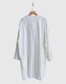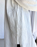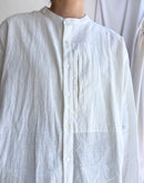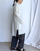 ヨコ糸にはハンドスパンされた綿糸を用い、タテ糸にはその綿糸2本ごとにベルギー産の厳選されたリネンの糸を織り込んだ手織りのオリジナル生地です。リネンの糸には特有の節があり、その節がネップ感を生み出し軽く柔らかい綿糸と合わさって味わいのある素材になりました。タテ糸にリネンを用いているため、落ち感があり、肌馴染みがよく着用ごとに柔らかく変化していく素材です。インド製