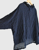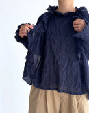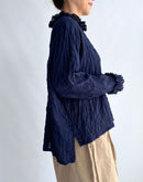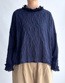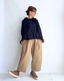 リネンコットン素材を使用した、軽くて柔らかな風合いのプルオーバー。 首元と袖口に施された繊細なフリルが、クラシカルな雰囲気を引き立てます。 程よくゆとりのあるボックスシルエットで、動きやすくリラックス感のある着心地。 肩のラインを落としたデザインが、自然な抜け感を演出します。 素材特有の自然なシワ感と柔らかな表情があり、洗いざらしで着ても様になる一枚。 デニムやワイドパンツ、スカートなど、幅広いスタイリングに活躍します。日本製