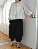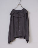 Gauze# の定番フリルブラウスが、今季は新たな表情に オリジナルラミーリネン・スモールドット生地を使用し、モダンカジュアルな印象の一枚にアップデート 軽やかな風合いと繊細なディテールは、日常に寄り添う一枚に。made in Japan