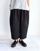 ブランド定番の《カミーユタックパンツ》。 今季はムラ糸で織り上げたバックサテン素材を使用し、 さりげない光沢と程よいハリ感が魅力です。 ウエストは総ゴム仕様でリラックス感がありながら、 タックの立体的なラインがマニッシュな印象を引き立てます。 シーズンを問わず着まわせるデイリーワードローブとして活躍する一枚。 Made in Japan