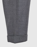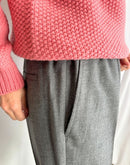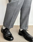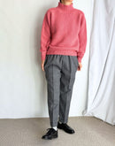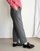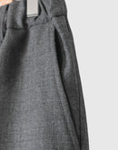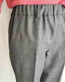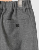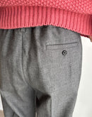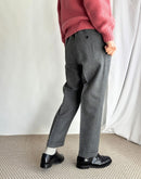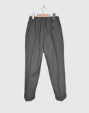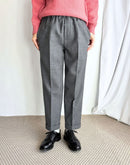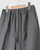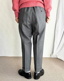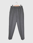 上品な印象を与える裾ダブル仕上げのセンタープレスパンツ。裾にかけてテーパードを効かせた美しいシルエットがポイント。ウエストはゴム仕様にプラス紐での調節が可能。スッキリとした見て目ではありますが、全体的にゆとりがあり、リラックスした着心地です。ベルトループ付きなので、ベルトをしたスタイルもお楽しみいただけます。日本製