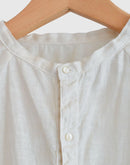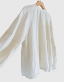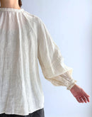 アトリエで絵筆を走らせるフランスの画家が纏うような一枚。 Gauze#の「アトリエ ブラウス」は、製品染めによってアンティークのような深い風合いをまとったリネン100%素材を使用しています。 前後どちらを前にしても着られる2wayデザインで、気分やスタイリングに合わせた着こなしを楽しめます。 ゆったりとしたシルエットに、ラグランスリーブと袖口のギャザーがほどよい抜け感を演出。シンプルながらも表情豊かなリネンの質感が、日常を特別なものに変えてくれるブラウスです。 職人の手仕事による風合いを楽しめる、永く愛用したいワードローブの一着。日本製