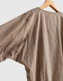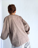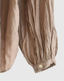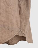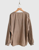 ヨコ糸にはハンドスパンされた綿糸を用い、タテ糸にはその綿糸2本ごとにベルギー産の厳選されたリネンの糸を織り込んだ手織りのオリジナル生地です。リネンの糸には特有の節があり、その節がネップ感を生み出し軽く柔らかい綿糸と合わさって味わいのある素材になりました。タテ糸にリネンを用いているため、落ち感があり、肌馴染みがよく着用ごとに柔らかく変化していく素材です。インド製