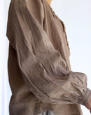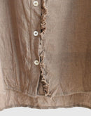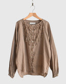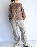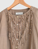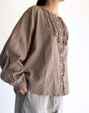 フリントに共地のフリルをあしらったカラーブラウス。フリル端は断ち切りにし、肩と後ろにはオリジナルカットのヨークを付けて、ガーリーすぎないカジュアルなブラウスに仕上がっています。フロントには手作りされたシェル釦を付けています。