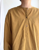 maison de soil(メゾン ド ソイル)のバンガロール コットンシルク プルオーバーシャツ。 南インドで丁寧に織られたコットン60%・シルク40%の生地を使用しています。縦糸には20/22DNのシルク、横糸には太めの60番コットンを用い、しっかりとした打ち込みによって光沢感とマットな質感を兼ね備えた独特の風合いを生み出しています。 生地染めによる深みのある色合いが魅力で、シンプルなプルオーバーシルエットに品の良さをプラス。ナチュラルながらもエレガントに着こなせる一枚です。インド製