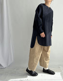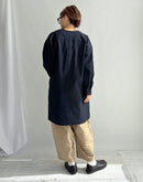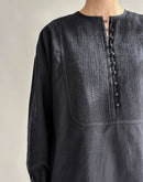縦糸84コットン x 横糸56Khadi糸の先染め糸を使用し、ヴィンテージの織機で手織りされたヘビーコットン生地。 横糸が太いため、少しハリ感があるのが特徴です。 すっきりとしたネックラインのクルーネックシャツは、女性らしい印象を与えてくれるデザイン。 前身頃にはくるみボタンと無数の細かなピンタックが施され、上品な印象に。 全体的にゆったりとしたシルエットで着心地の良さもポイントです。インド製