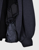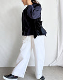 スウェットなのにきちんと可愛いTOPS。GTHオリジナルのループを残した絶妙な厚さの裏毛に、毛羽立ちの少ないコットンの凹凸感があるハニカム組織と切り替えて、ブロード、コードレース、ビンテージ感のあるシワ感と優しい光沢感が美しいサテン、様々な素材でフリルをアシンメトリーに重ね付けました。フリルの下を切り替えて、脇のシルエットが綺麗に出るようにしているのもこだわりポイントです。お袖は丸いシルエットを出すため、3箇所に剥ぎを入れてふんわりと立体的に仕上げています。一枚できちんと可愛いお洒落が完成。