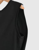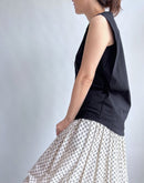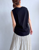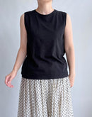 肌触りの良い国産コットン天竺を使用した、上品な光沢としなやかな落ち感が魅力のタンクトップ。 肩に入れたタックディテールがフェミニンなアクセントとなり、シンプルながら立体的な表情を生み出します。 前後差をつけたヘムラインはボトムスにすっきりと収まりつつ、腰まわりをさりげなくカバー。 アームホールはややコンパクトに設計しつつも、締めつけすぎない絶妙な幅感で、一枚着はもちろんジャケットやカーディガンのインにも最適です。日本製