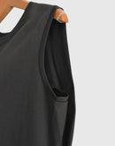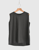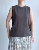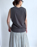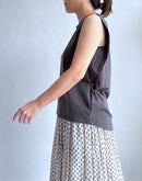 肌触りの良い国産コットン天竺を使用した、上品な光沢としなやかな落ち感が魅力のタンクトップ。 肩に入れたタックディテールがフェミニンなアクセントとなり、シンプルながら立体的な表情を生み出します。 前後差をつけたヘムラインはボトムスにすっきりと収まりつつ、腰まわりをさりげなくカバー。 アームホールはややコンパクトに設計しつつも、締めつけすぎない絶妙な幅感で、一枚着はもちろんジャケットやカーディガンのインにも最適です。日本製