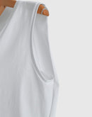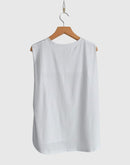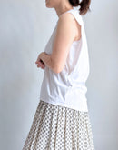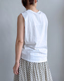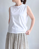 肌触りの良い国産コットン天竺を使用した、上品な光沢としなやかな落ち感が魅力のタンクトップ。 肩に入れたタックディテールがフェミニンなアクセントとなり、シンプルながら立体的な表情を生み出します。 前後差をつけたヘムラインはボトムスにすっきりと収まりつつ、腰まわりをさりげなくカバー。 アームホールはややコンパクトに設計しつつも、締めつけすぎない絶妙な幅感で、一枚着はもちろんジャケットやカーディガンのインにも最適です。日本製