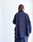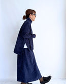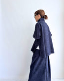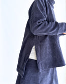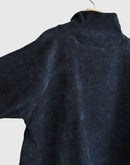 両面起毛でふんわり柔らかなベロア調ジャージーを使用したハイネックトップス。 滑らかな肌触りと上品な光沢感があり、ウールが苦手な方にも心地よく着用いただける一枚です。 厚みのあるオフタートルが首元をやさしく包み、 台形シルエットにフレアを効かせた身頃が美しいドレープを生み出します。 サイドスリットが抜け感を添え、ラグランスリーブと長めの袖口デザインがメリハリのあるシルエットに。 デイリーにも特別なお出かけにも、落ち着きある華やかさをプラス。 同素材の“YELL”スカート(LKL25WSK2049)とのセットアップスタイルもおすすめです。